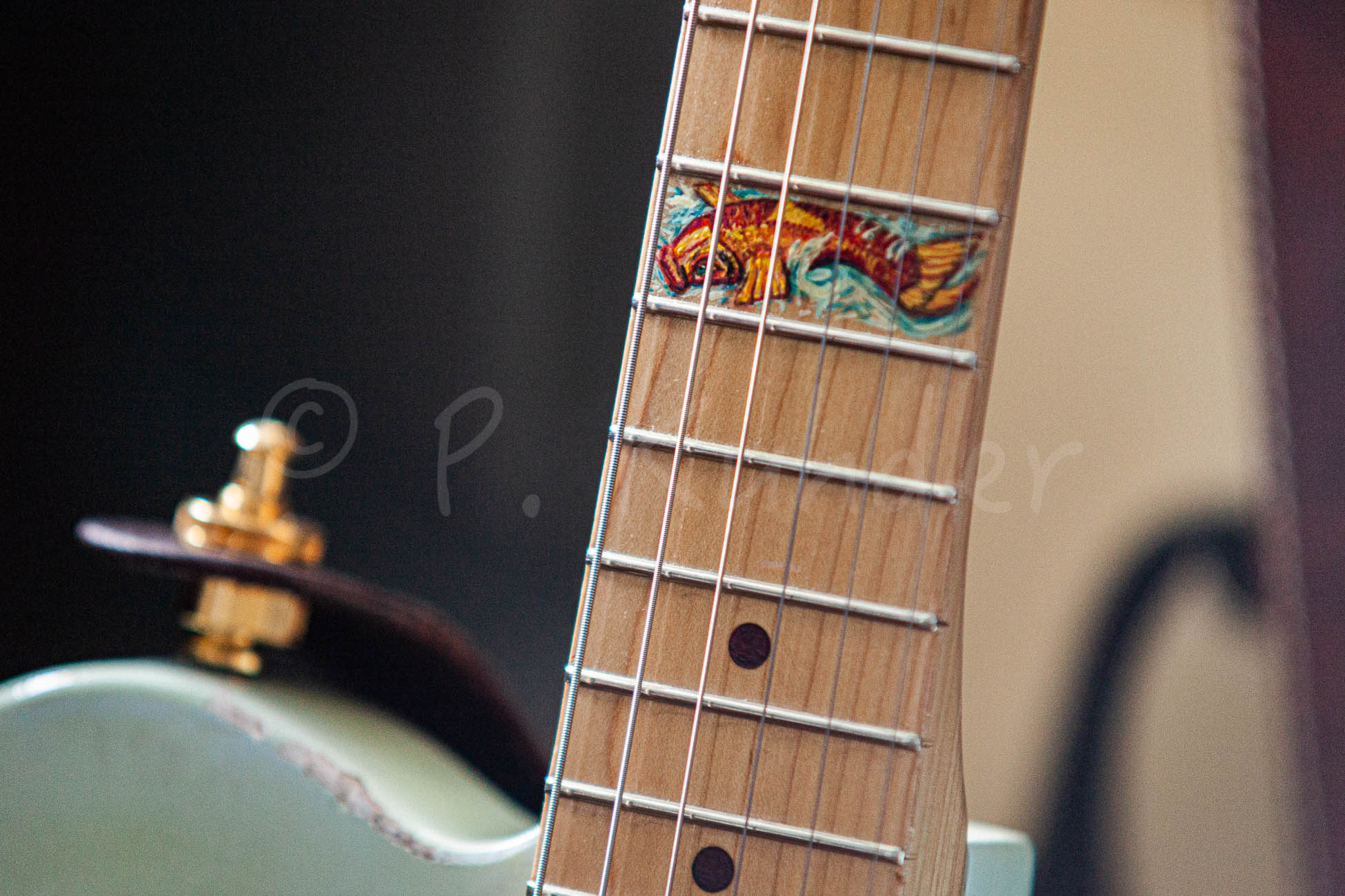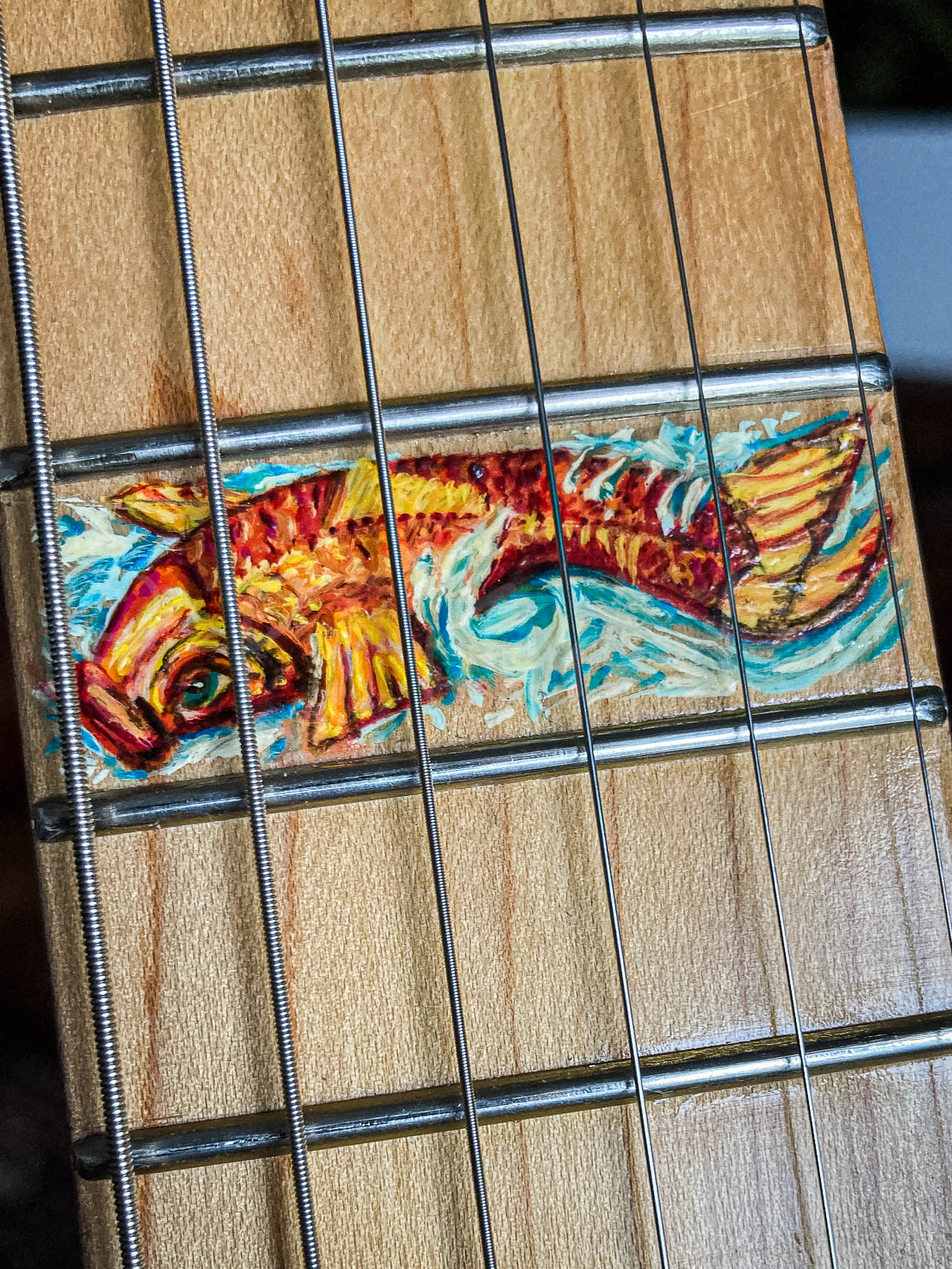 On the 12th fret I painted a koi carp in a very bright cadmium orange.